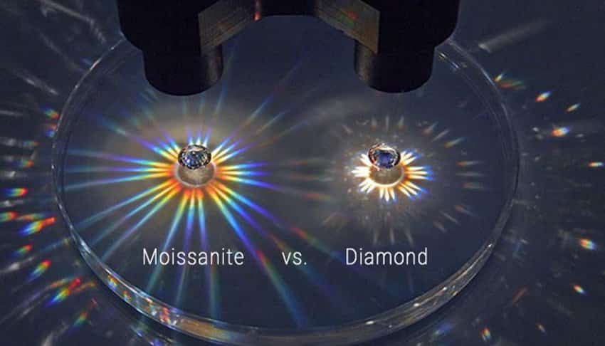 Moissanite không giống với kim cương. Moissanite được tạo ra trong phòng thí nghiệm từ silicon carbide, trong khi kim cương được tạo thành từ carbon. Mặc dù trông giống nhau, nhưng chúng khác nhau về tính chất. Moissanite lấp lánh hơn với các tia sáng màu, được gọi là "lửa", vì nó khúc xạ ánh sáng khác với kim cương.